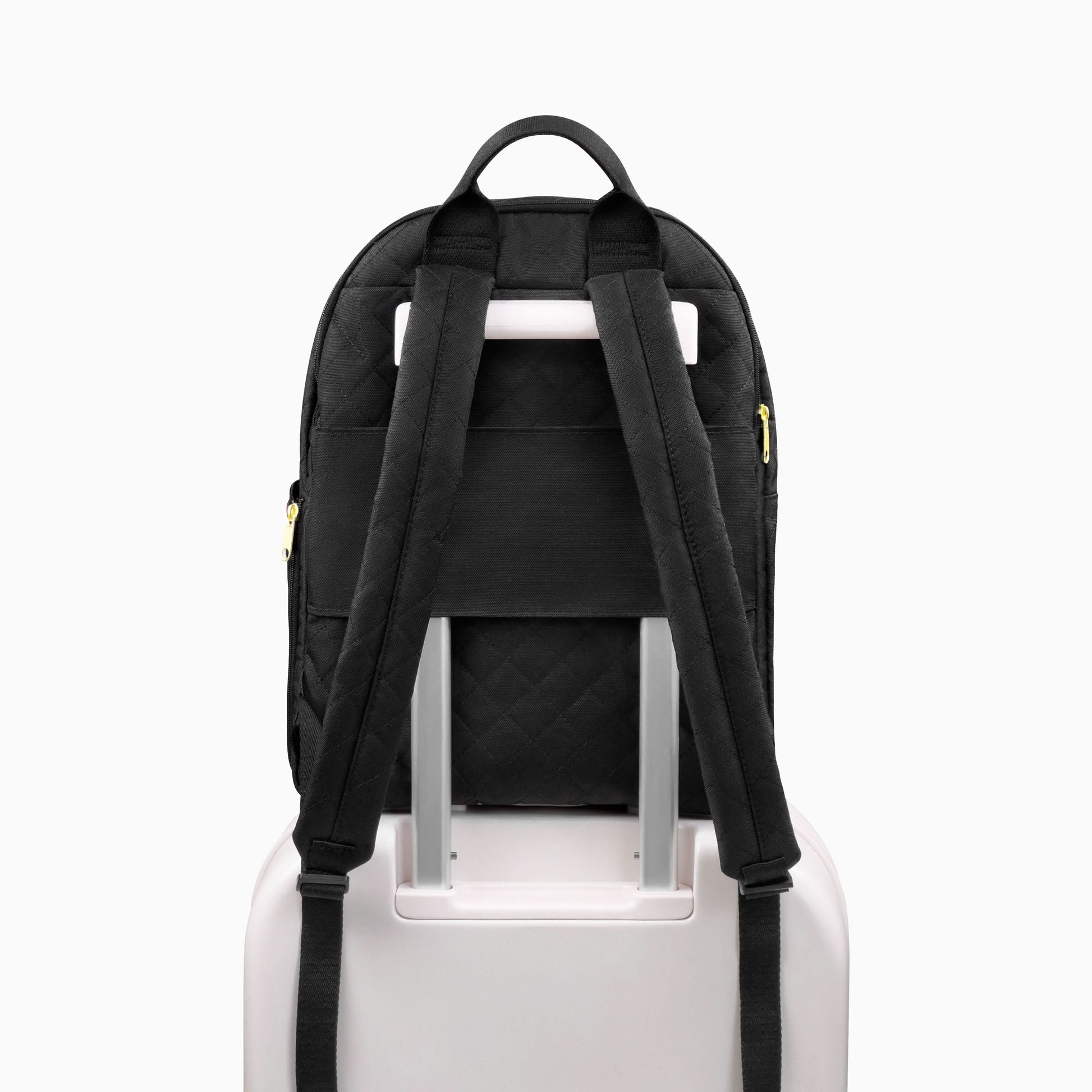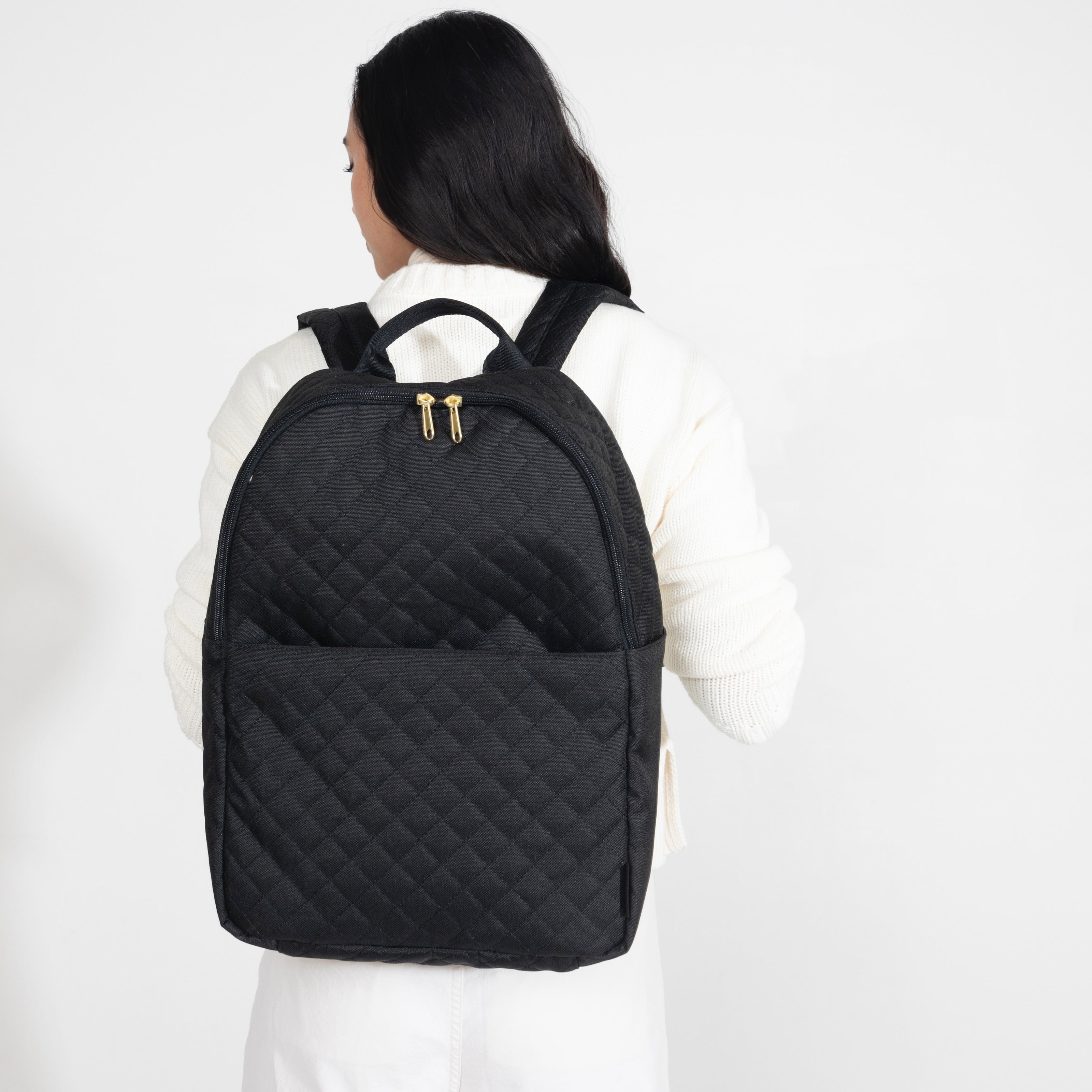 I purchased the large Quilted Black backpack for some upcoming trips. I needed a larger backpack than my current backpack and I wanted a trolley sleeve and light interior. This backpack checks all the boxes for me. The size is nice to have, the straps are comfortable for carrying over periods of time and the quilted fabric just elevates it more. Nice organization with plenty of zipper and slip pockets throughout. The zipper water bottle pocket can accommodate many sizes of bottles. Definitely would recommend.