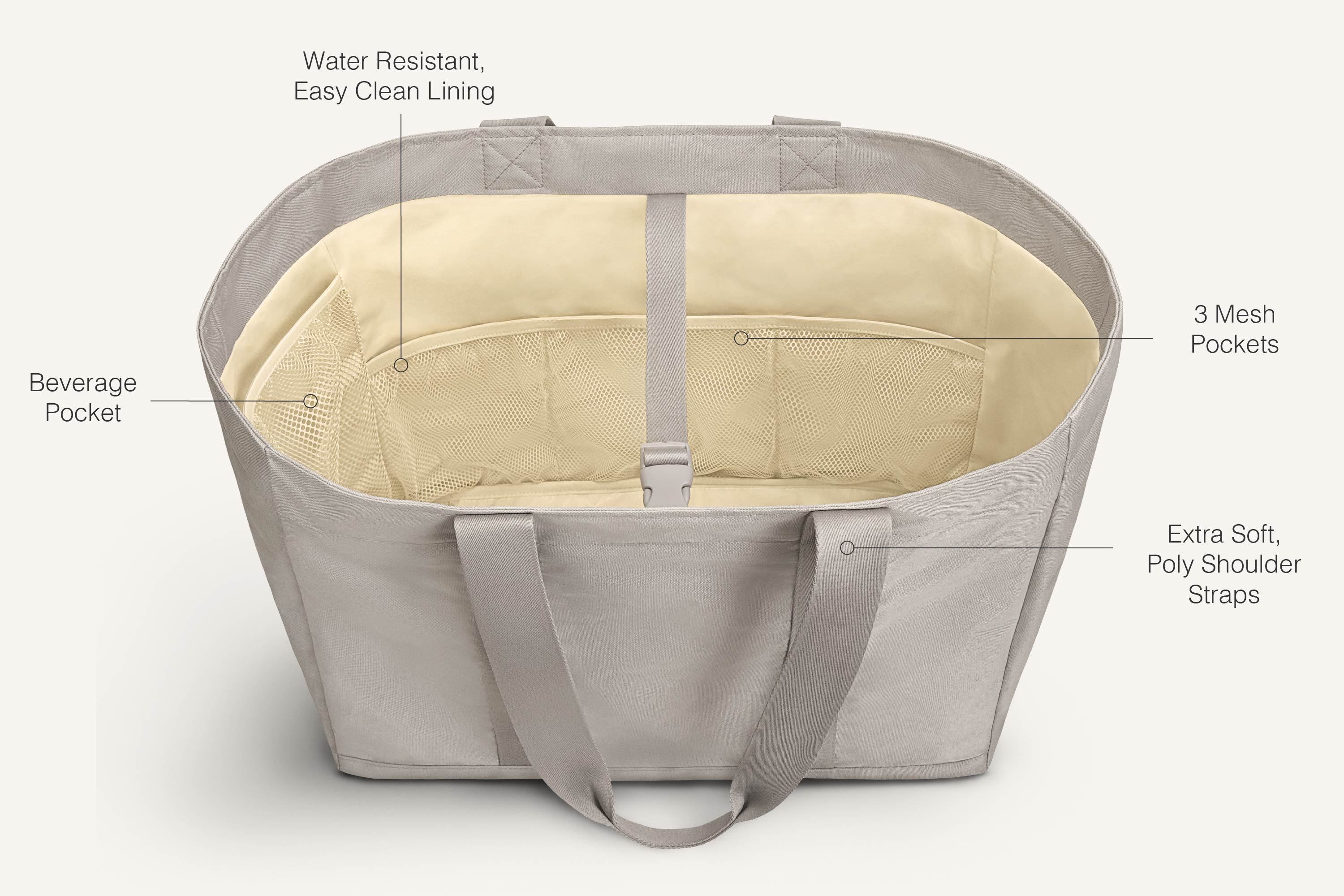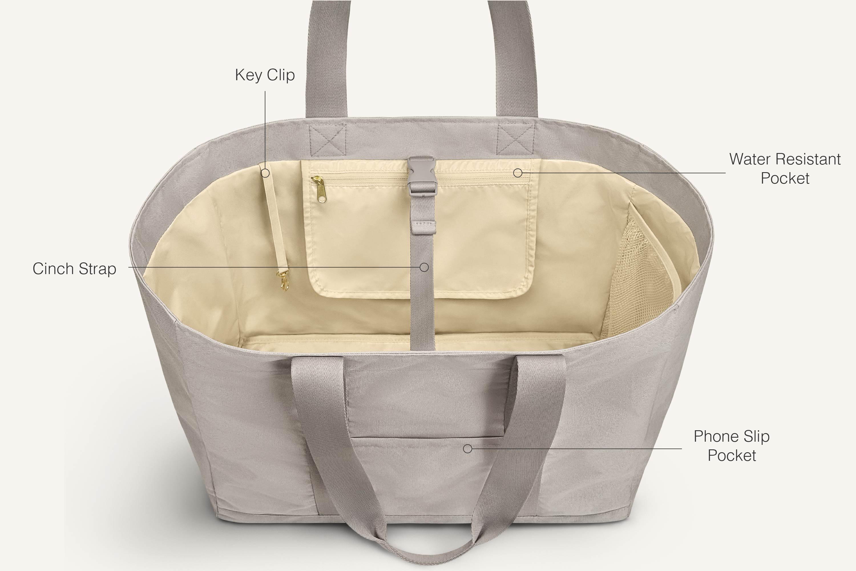 Every pocket’s made with beach days and messy moments in mind: mesh side pockets let sand and water drain out, a waterproof internal pocket keeps valuables dry, a cinch strap that keeps everything secured while still providing easy access to what’s inside, and an external phone slip pocket keeps your phone secure without having to dig. Lightweight, roomy, and easy to carry, whether you're packing towels, snacks, or all the extras.