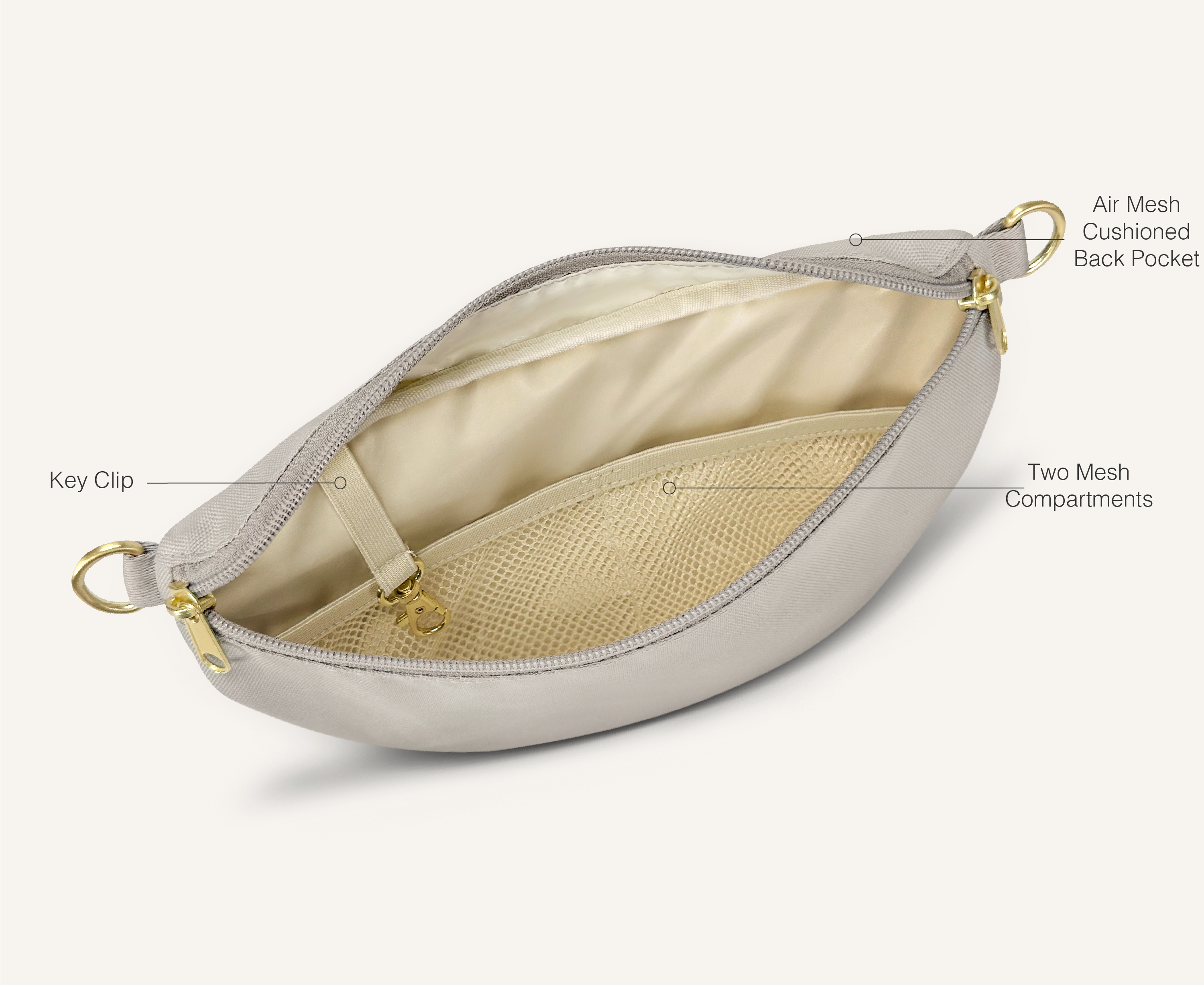 A comfortable, contoured shape with gold hardware gives it a refined finish, while thoughtful details like an air mesh back pocket, two interior mesh compartments, and a secure key clip keep your essentials organized without the bulk.