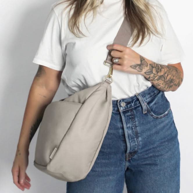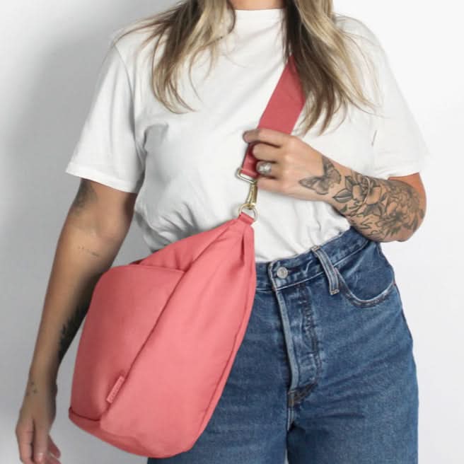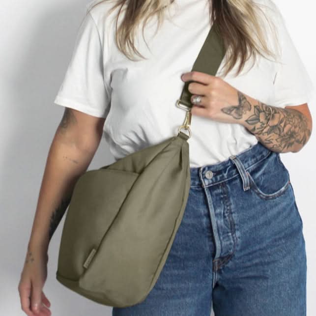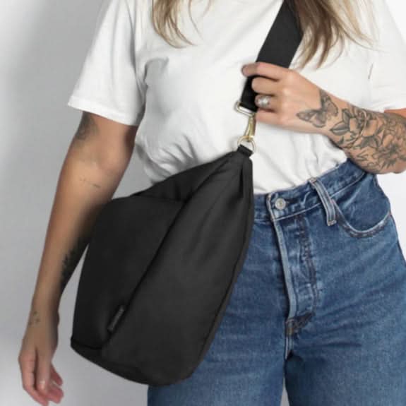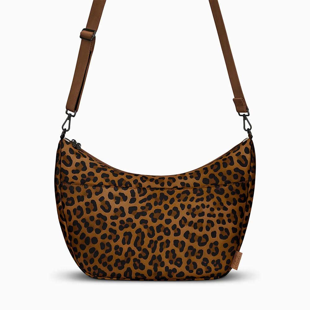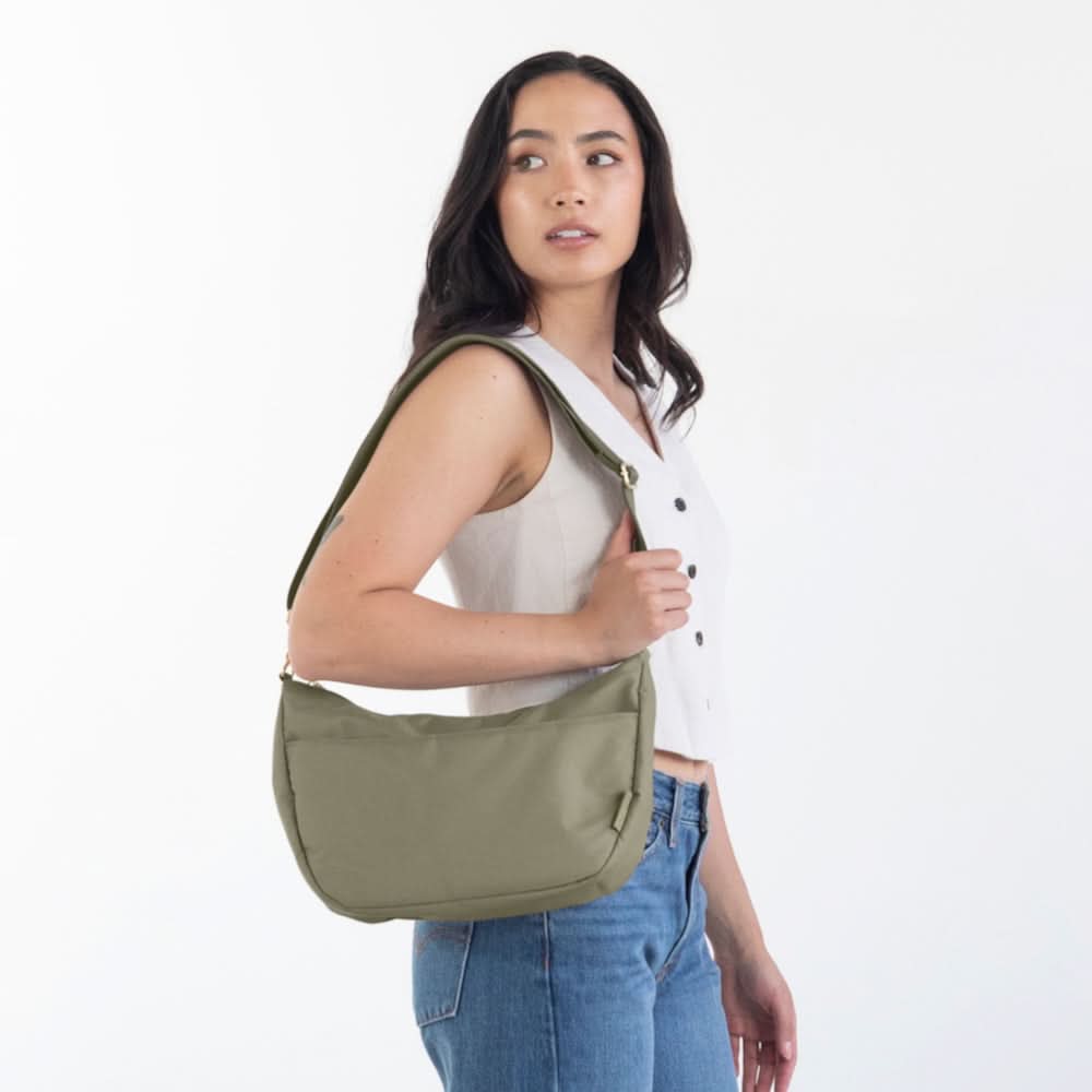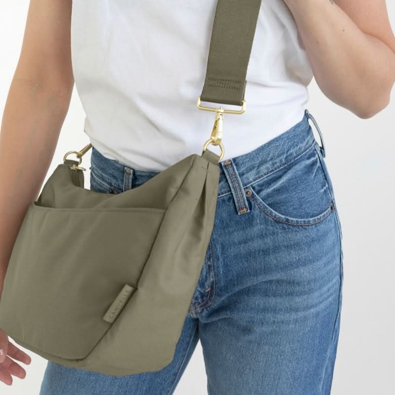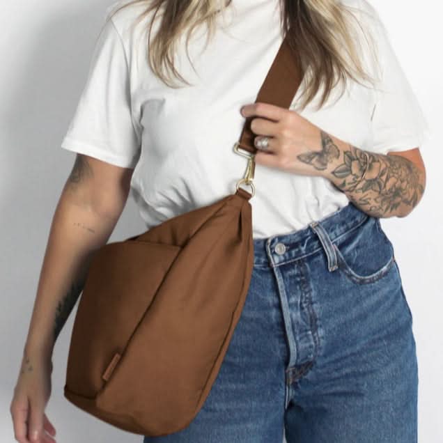 The Medium Crescent is compact yet roomy for the everyday, while the Large adds extra space plus an internal mesh beverage pocket. Both come with our standard crossbody strap.