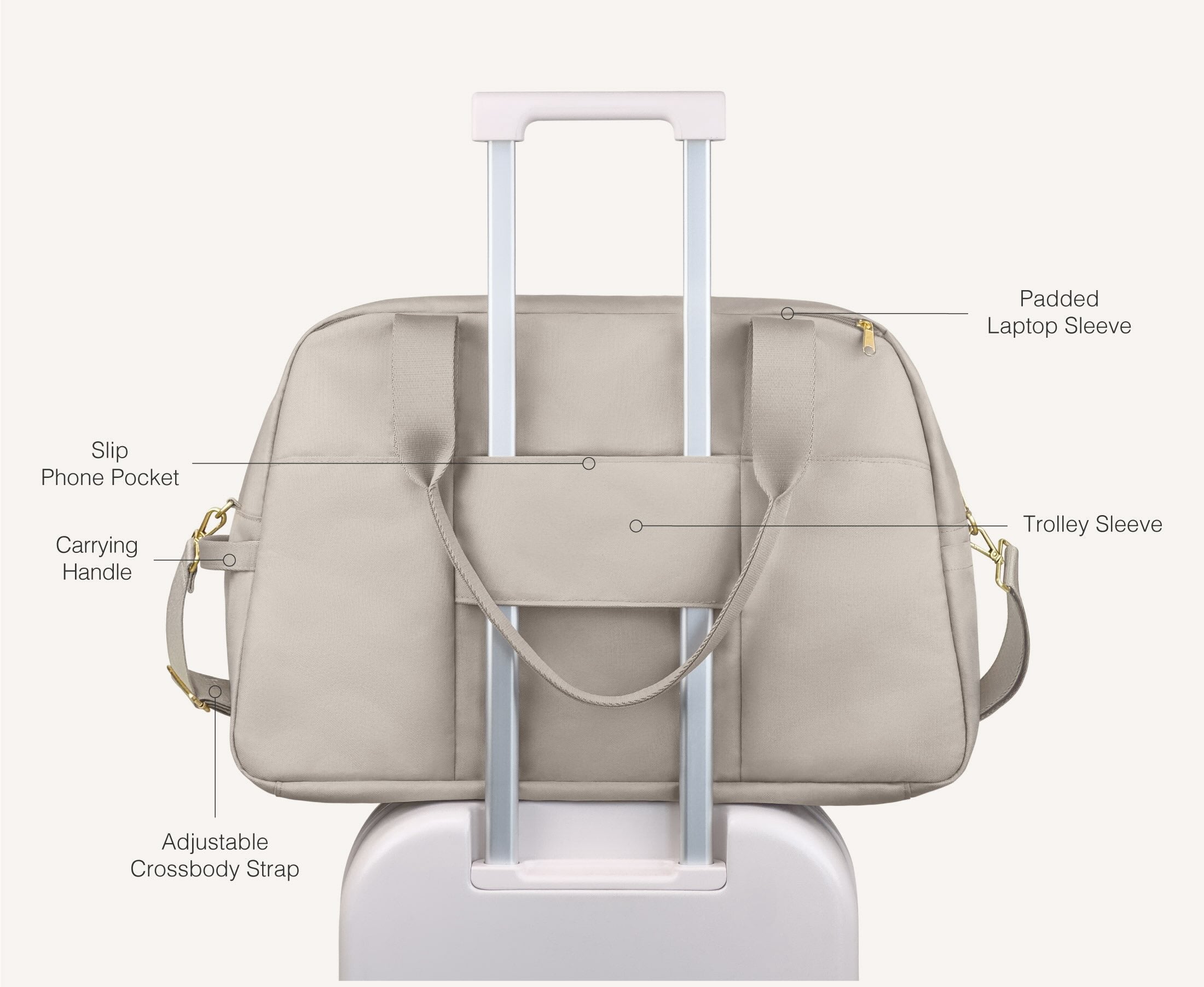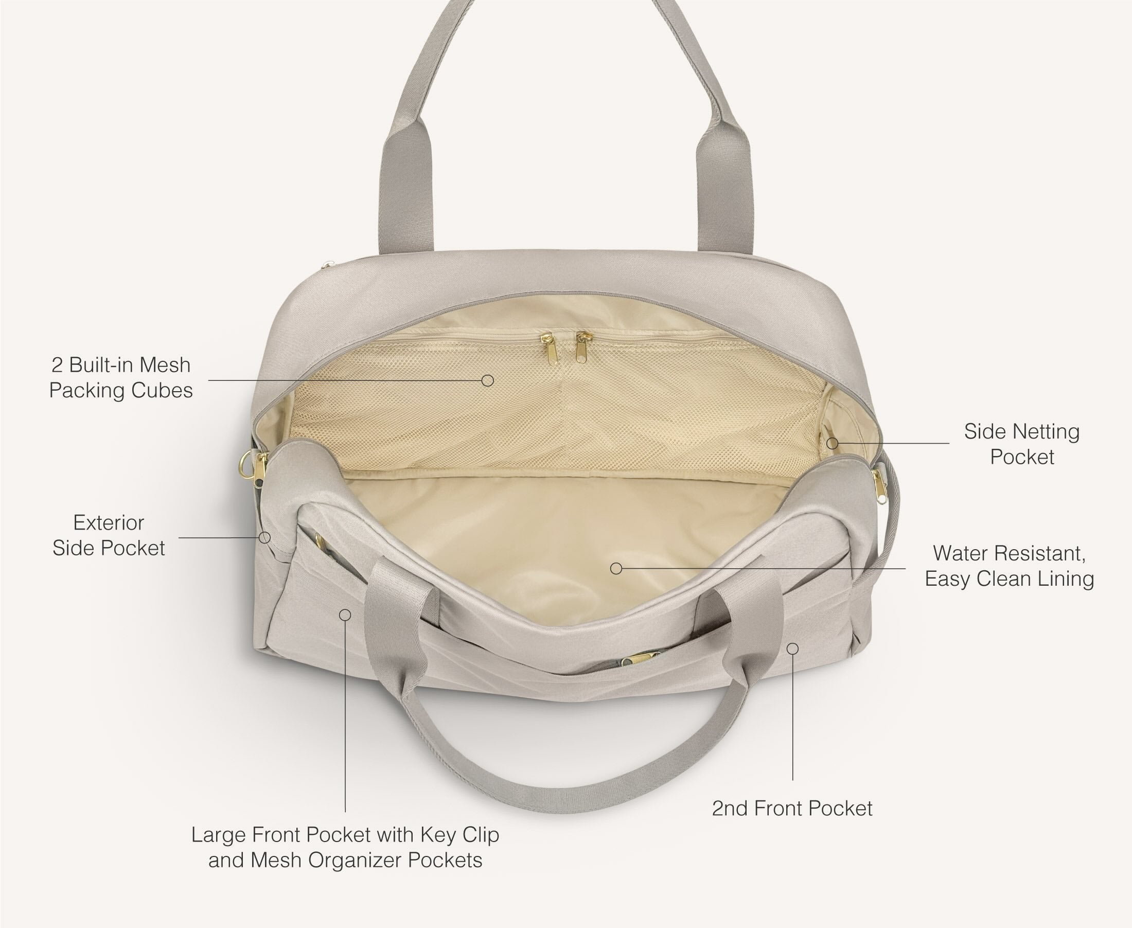 It’s loaded with smart details: a trolley sleeve, padded laptop sleeve, slip phone pocket, key clip, two built-in mesh packing cubes, an exterior side pocket, and interior netting to keep the little things sorted. Carry it your way with side handles, shoulder straps, or the adjustable crossbody strap.