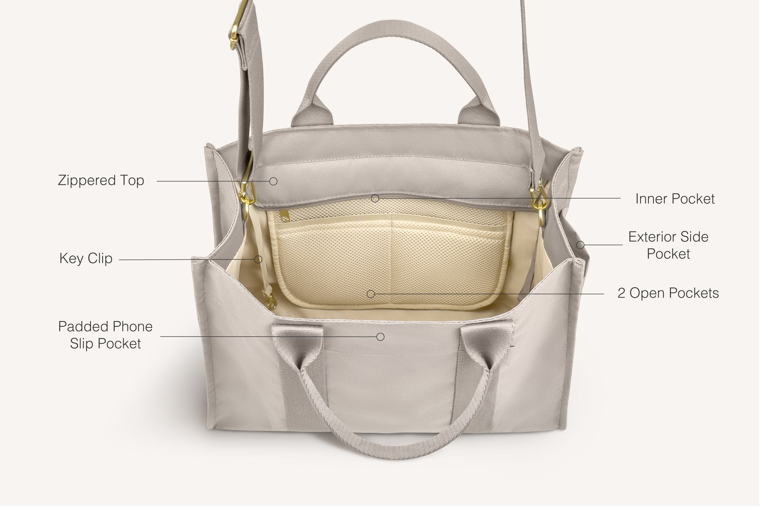 The perfect size tote, hold a ton of work stuff like binders notebooks & a 15” computer. Love the light color wipe able interior and zip top. The padded phone pocket is so smartly designed both hidden but easily accessible on the outside of the top zip. This bag packs a punch while still staying compact.