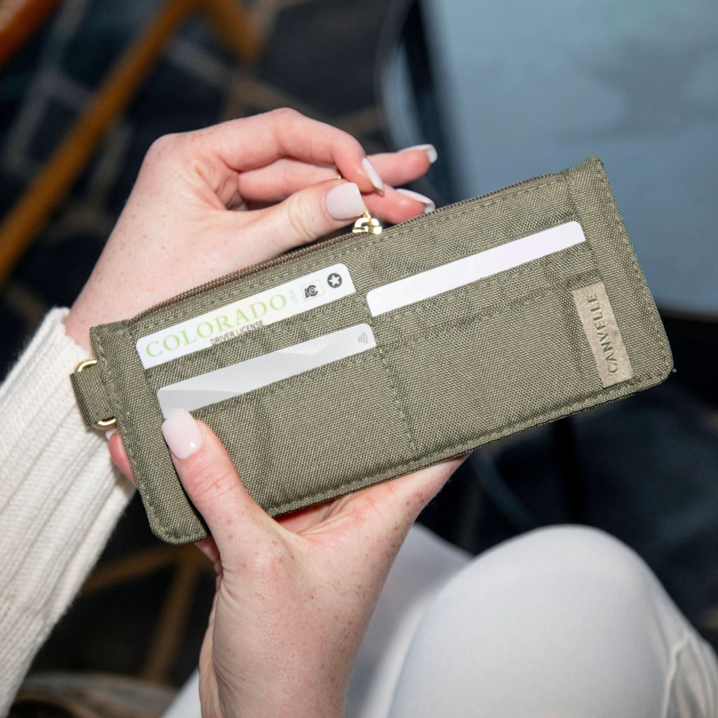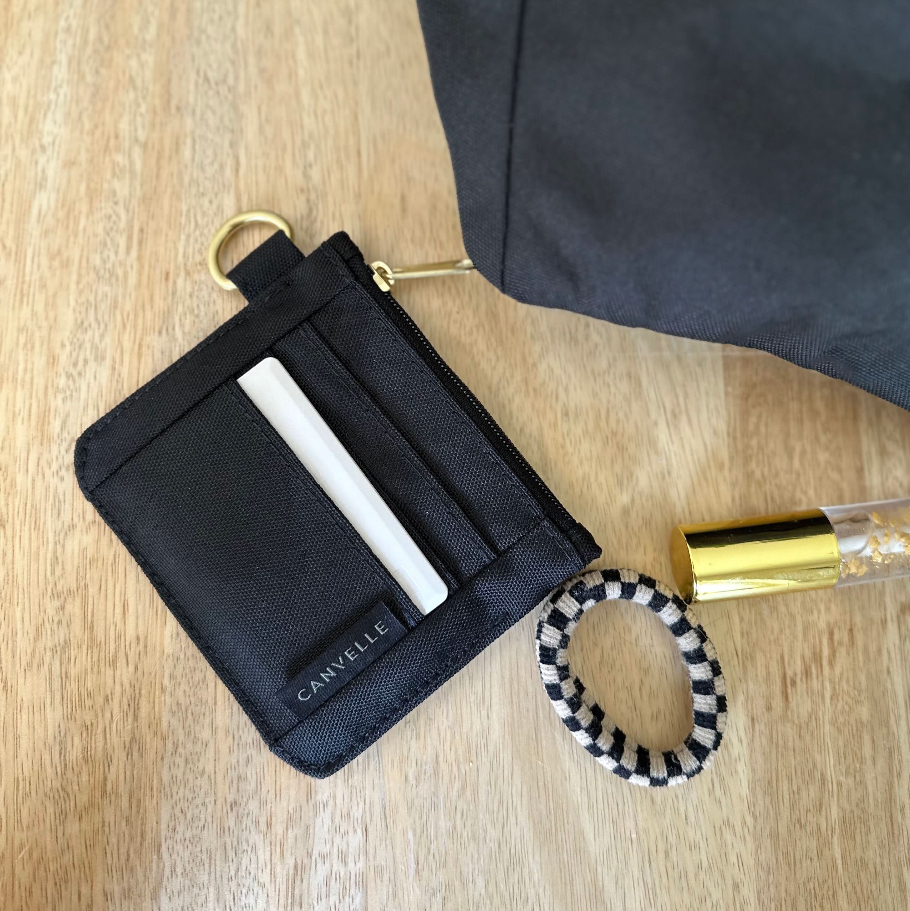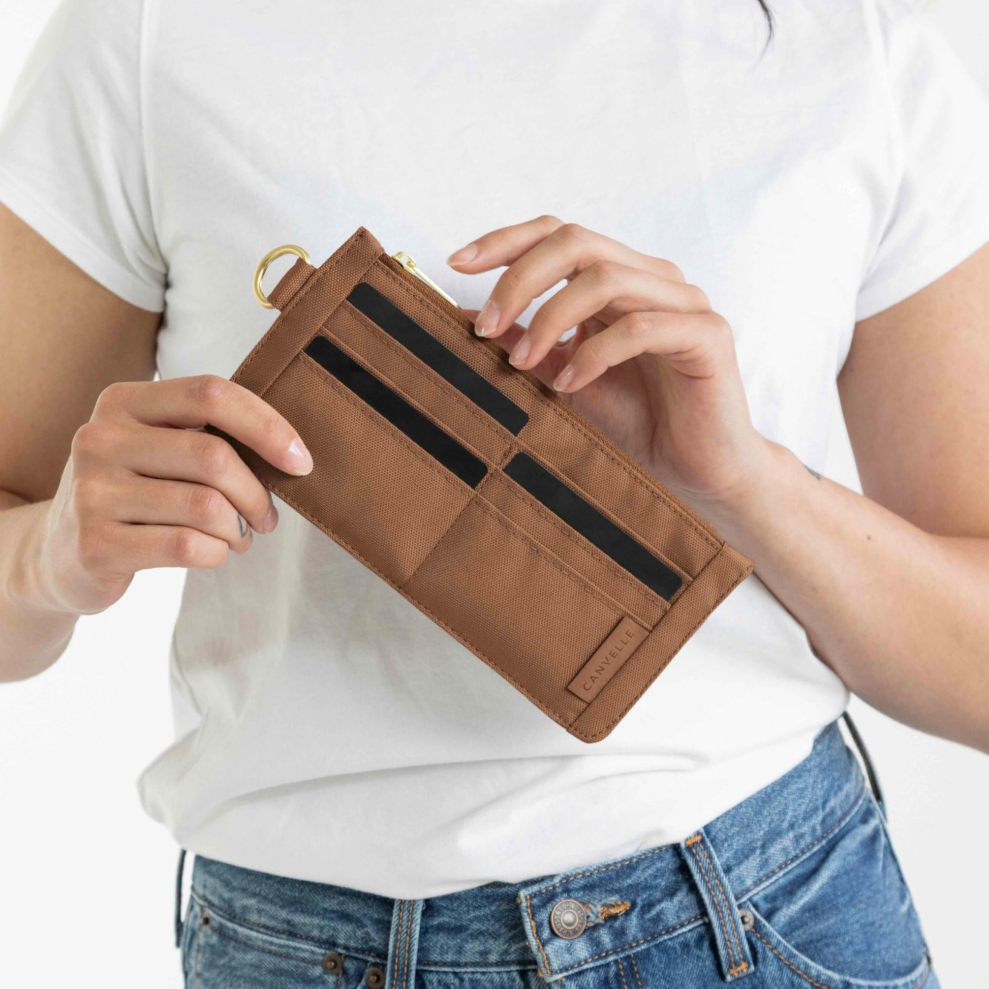 The Cardholder has six card slots with a small, water-resistant zip pouch for cash, coins, or everyday extras. The Slim Wallet includes the same features plus a zip phone pocket. Both are lightweight, durable, and come with a D-ring for easy attachment to key clips in our other bags.