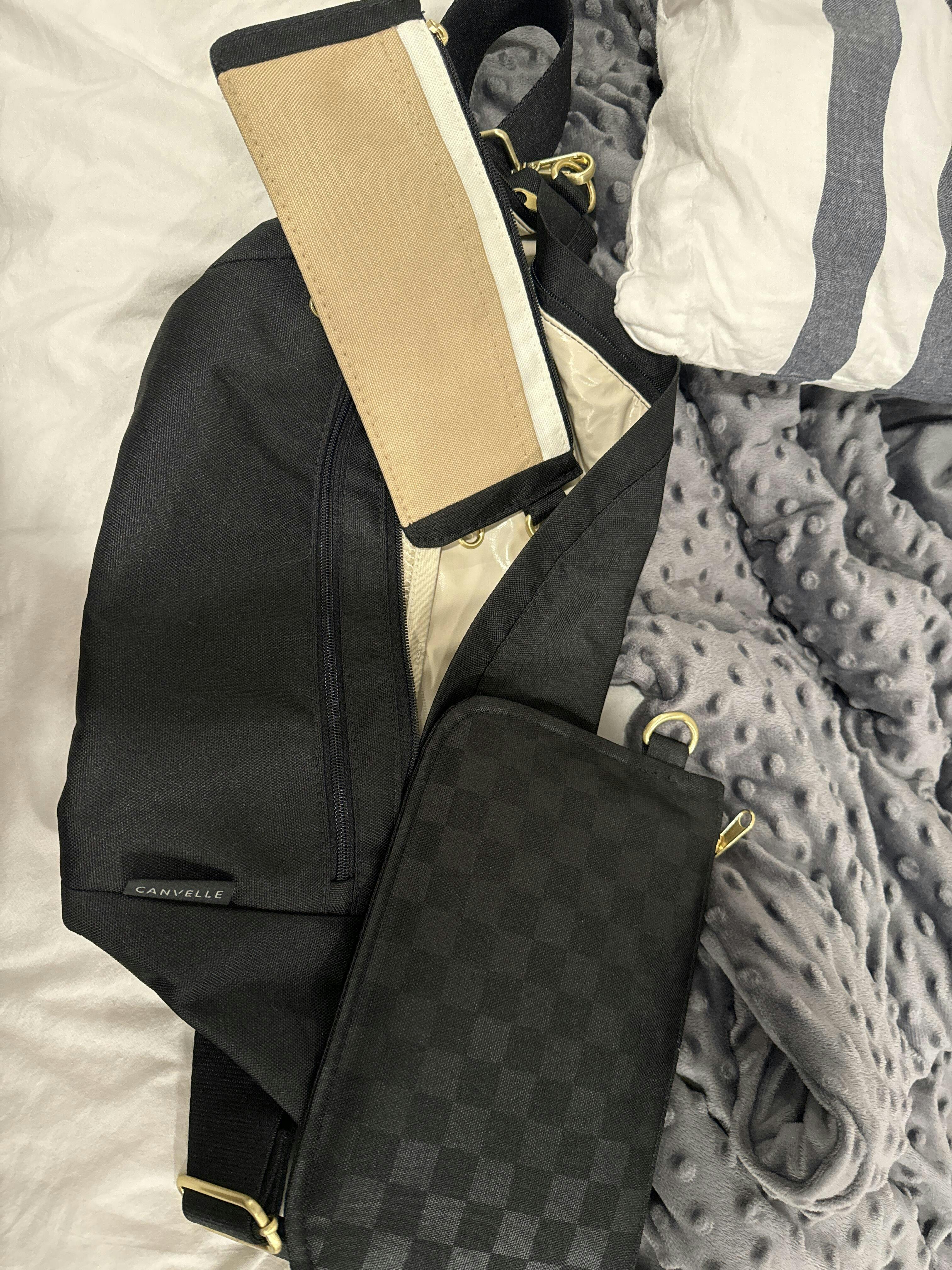 - Remove the strap and open all zippers