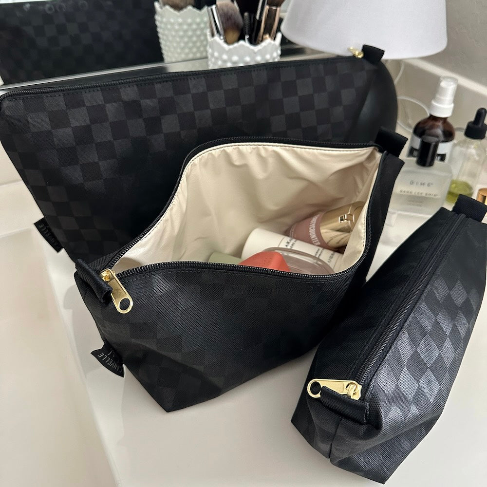 They come in three handy sizes: Small for makeup and little things, Medium for travel-size toiletries, and Large for full-size must-haves. Lightweight, water-resistant, and easy to pack into any of our bags.